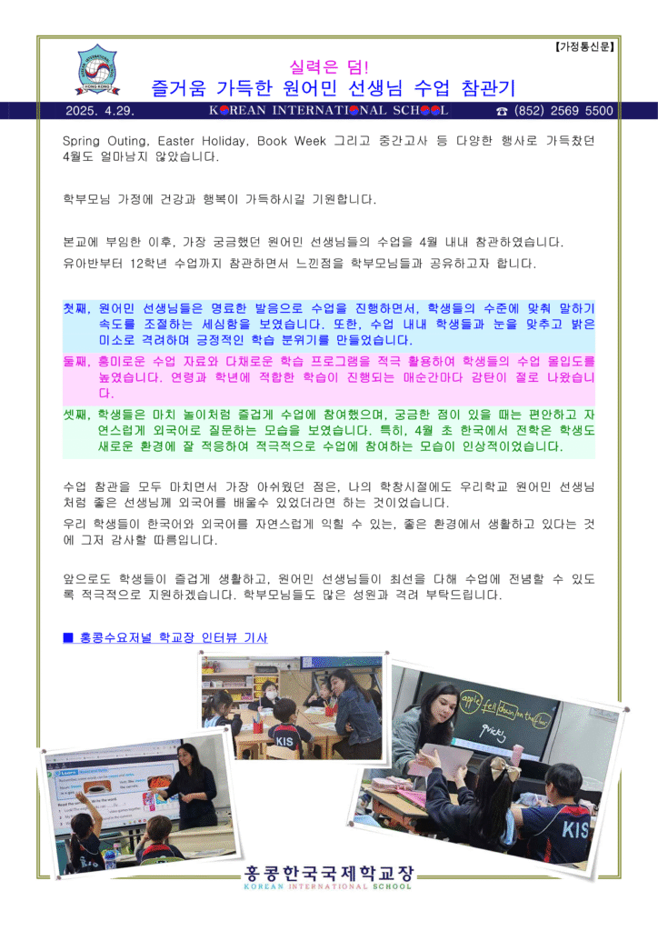 안녕하십니까 학부모님, 2025학년도 학교운영위원회 구성을 위한 선출공고 및 입후보자 접수를 진행한 결과, 네 분 모집에 네 분(연임하시는 두 분 포함)이 지원해주셔서, 선거공보나 선거 없이 아래와 같이 당선을 공고합니다. 학부모님의 많은 관심과 참여에 진심으로 감사드립니다. 붙임1. 학교운영위원회 학부모위원 당선 공고문 1부. 끝. 홍콩한국국제학교 학교운영위원회학부모위원 선출관리위원장 (담당 학운위 간사 전아람) ______________________________________________________________________ 붙임1. 학교운영위원회 학부모위원 당선 공고문 2025학년도…