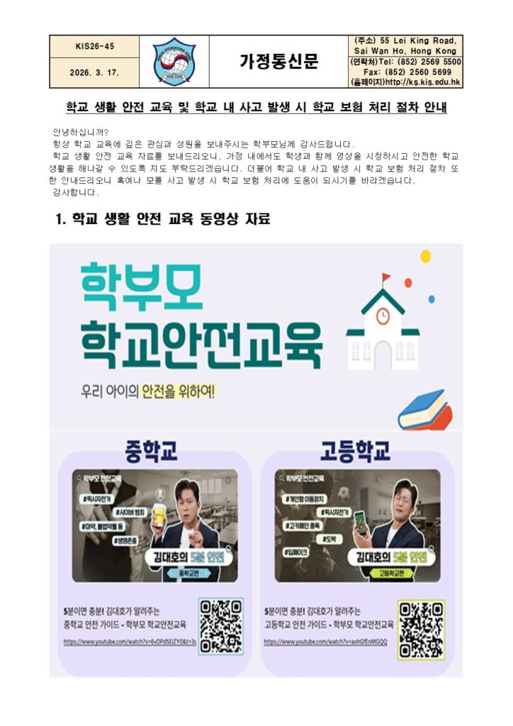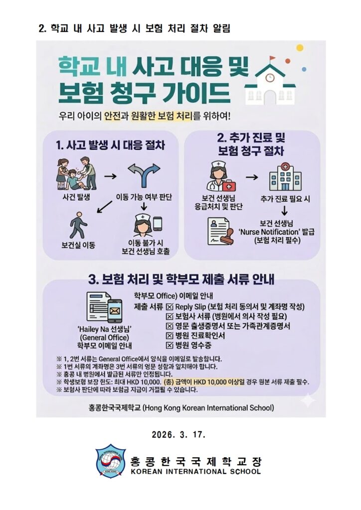 [가정통신문] 학교 생활 안전 교육 및 학교 내 사고 발생 시 보험 처리 절차 안내