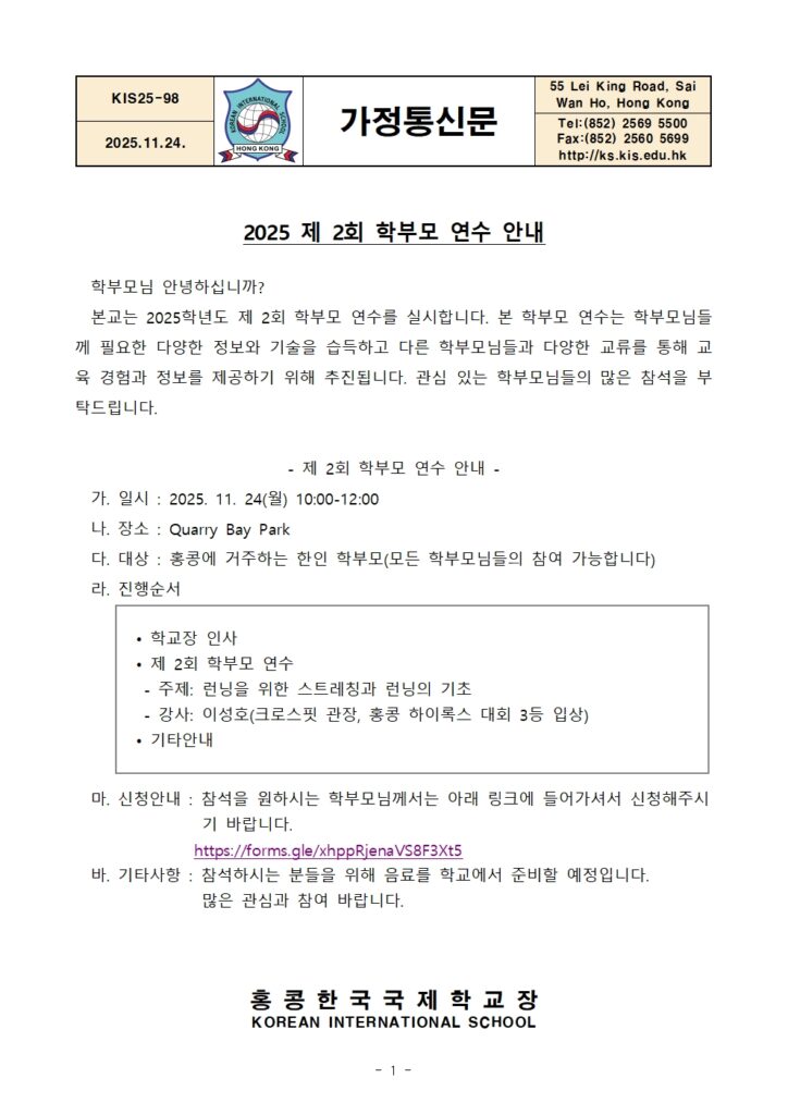 안녕하십니까 학부모님, 2025학년도 학교운영위원회 구성을 위한 선출공고 및 입후보자 접수를 진행한 결과, 네 분 모집에 네 분(연임하시는 두 분 포함)이 지원해주셔서, 선거공보나 선거 없이 아래와 같이 당선을 공고합니다. 학부모님의 많은 관심과 참여에 진심으로 감사드립니다. 붙임1. 학교운영위원회 학부모위원 당선 공고문 1부. 끝. 홍콩한국국제학교 학교운영위원회학부모위원 선출관리위원장 (담당 학운위 간사 전아람) ______________________________________________________________________ 붙임1. 학교운영위원회 학부모위원 당선 공고문 2025학년도…