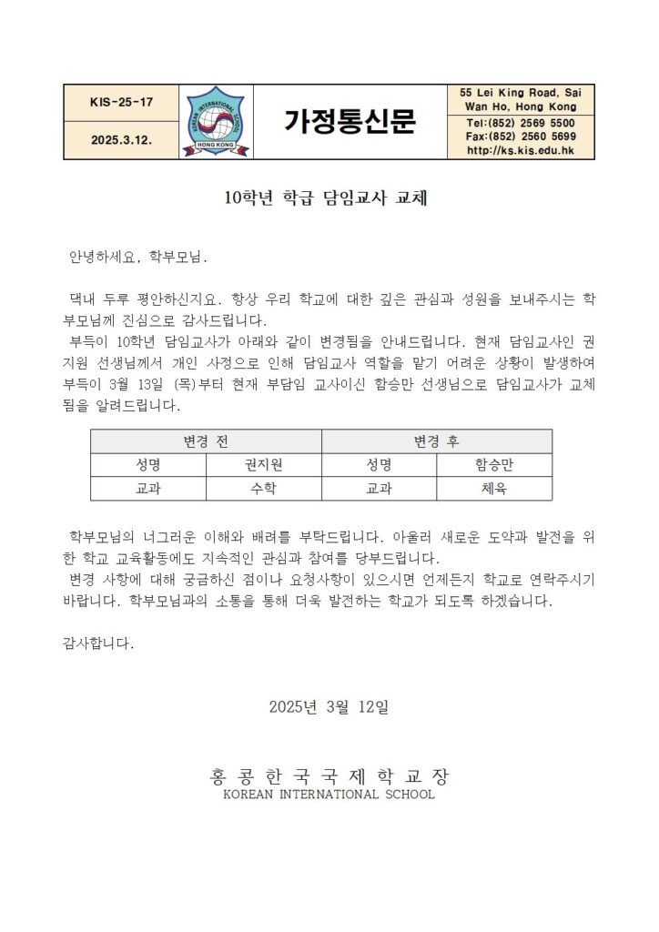[가정통신문]10학년 학급 담임교사 교체 취소