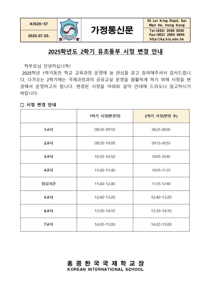 [가정통신문] 2학기 유초등부 시정 변경 안내