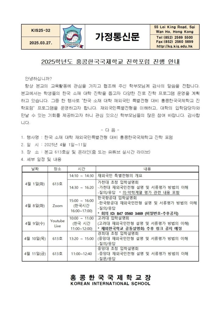 [가정통신문]2025학년도 홍콩한국국제학교 2차 진학포럼 진행 안내