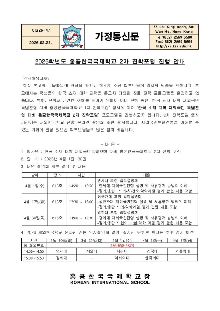 [가정통신문] 2026학년도 홍콩한국국제학교 2차 진학포럼 진행 안내
