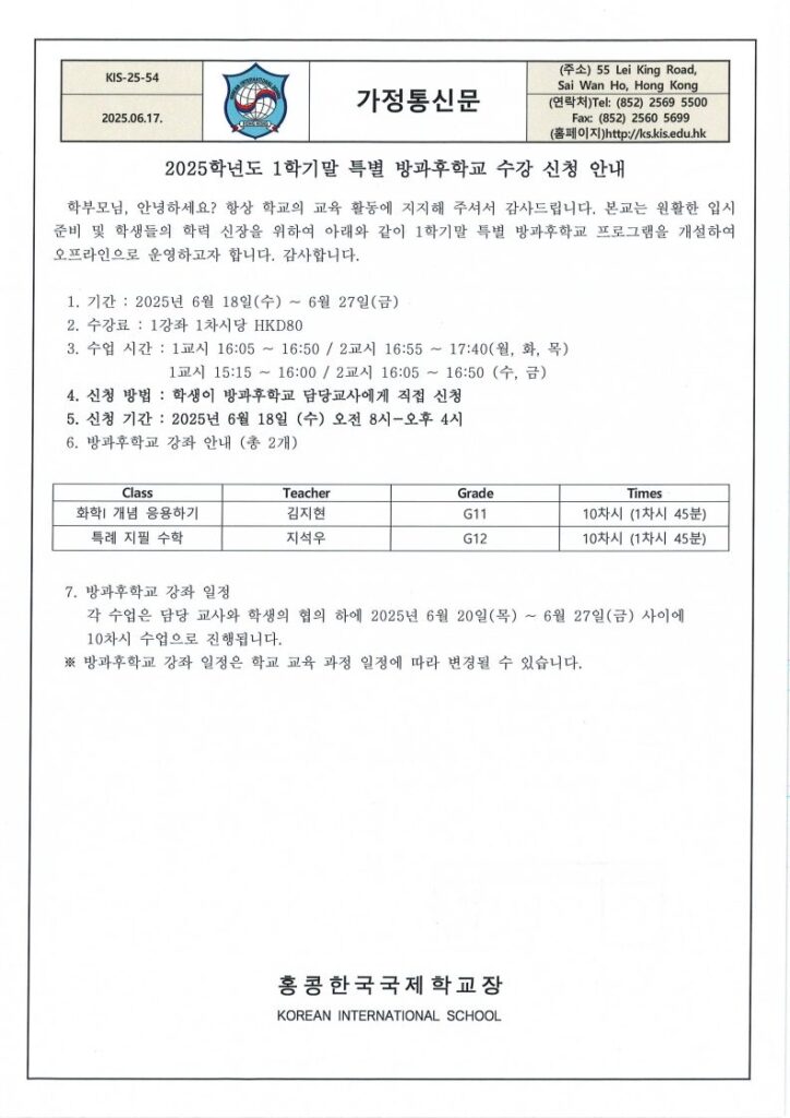 KIS25-542025학년도-1학기말-특별-방과후학교-수강-신청-안내