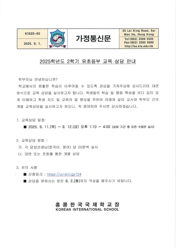 [가정통신문]2025학년도 2학기 유초등부 교육상담 안내
