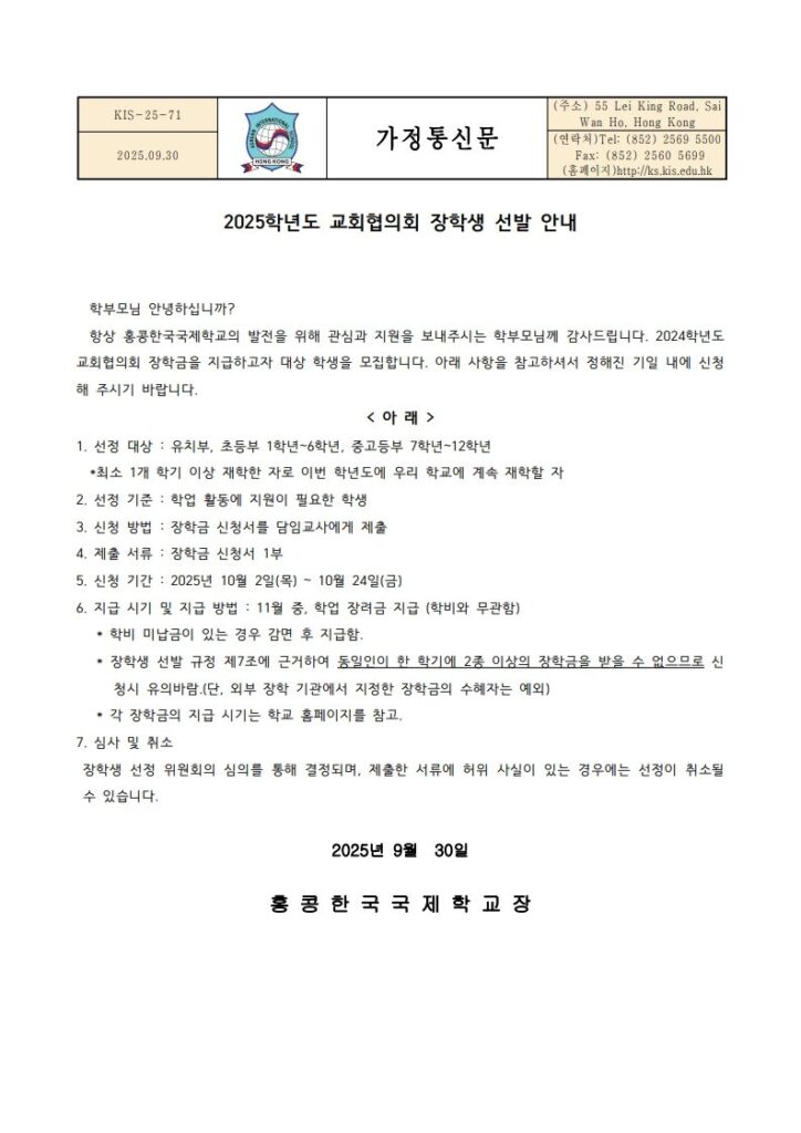 [가정통신문]2025 교회협의회 장학금 신청 기한 연기 안내