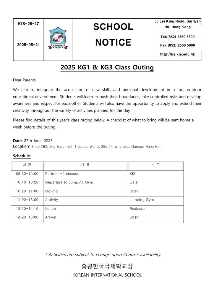 [가정통신문]KG1, KG3 CLASS OUTING