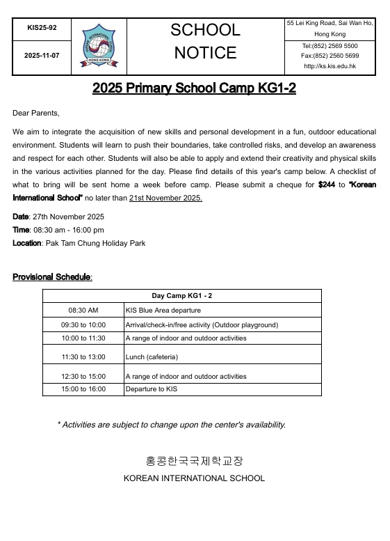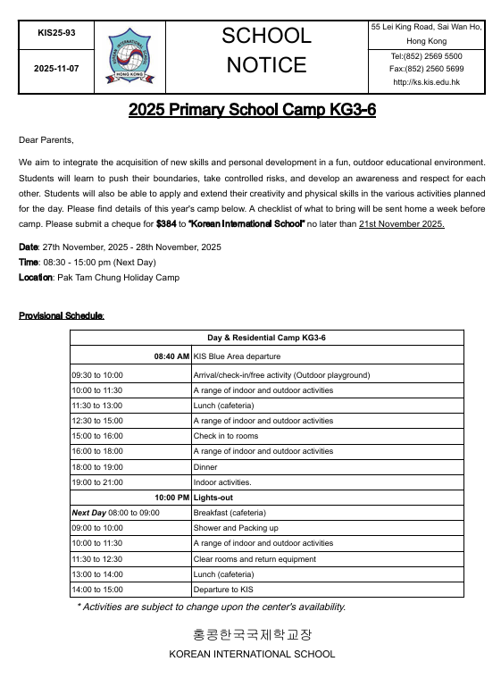 2025년 11월 27일로 예정된 School Camp와 관련하여 안내사항이 있으니 가정통신문을 참고하시기 바랍니다.