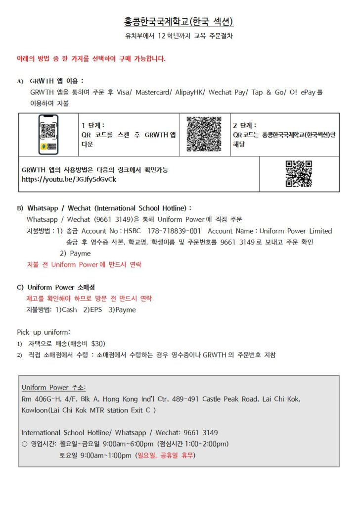 ○ 홍콩 한국국제학교 모든 재학생들은 교복을 구입 후 착용해야 한다. 학생들은 교복을 청결하게 유지해야 하고