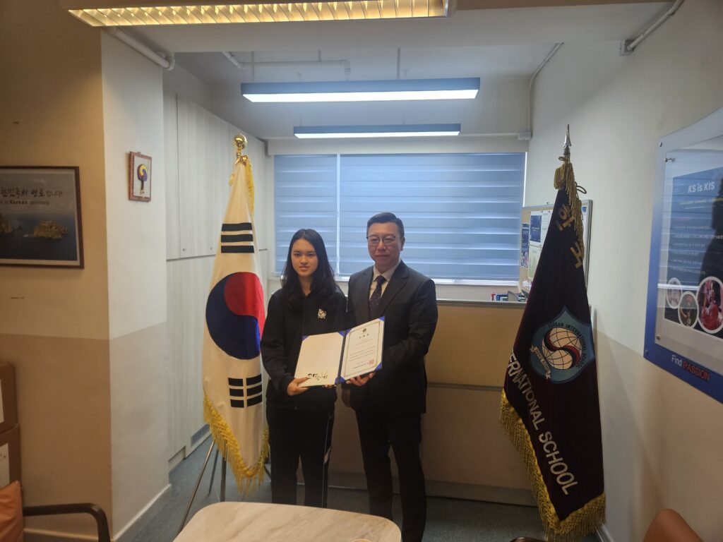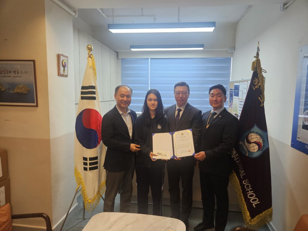 지난 4월 22일(수), 홍콩한국국제학교 교장실에서 우리 학교 11학년 최민서 학생기자에 대한 민주평화통일자문회의(이하 민주평통) 홍콩지회 명예위원 위촉 및 장학금 수여식이 거행되었습니다.