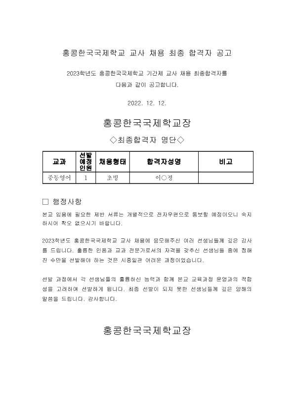 2023학년도 교원채용 (중등 영어) 최종 합격자 공고