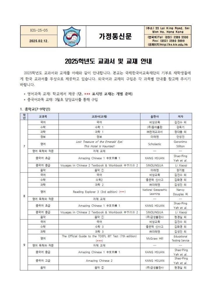 2025학년도 교과서 및 교재 안내