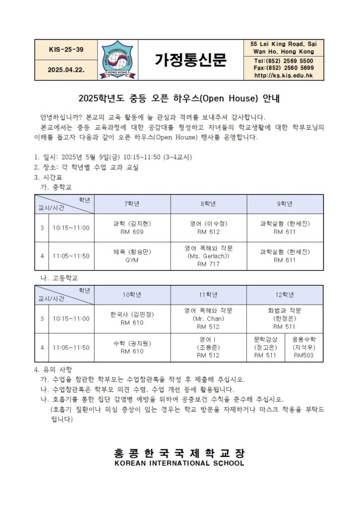 [가정통신문] 2025학년도 홍콩한국국제학교 진학포럼 진행 안내