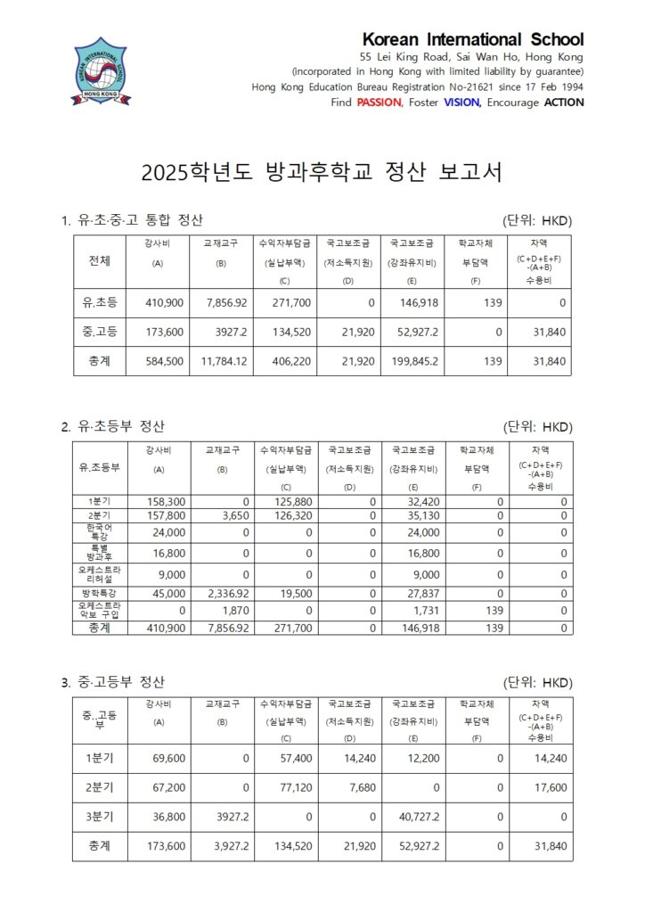 2025학년도 방과후 학교 정산 내역을 아래와 같이 알려드립니다.