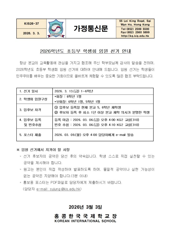 다음과 같이 2026 초등부 학생회 임원 선거를 실시하고자 합니다. 희망하는 학생은 담임선생님을 통해 신청하기 바랍니다.