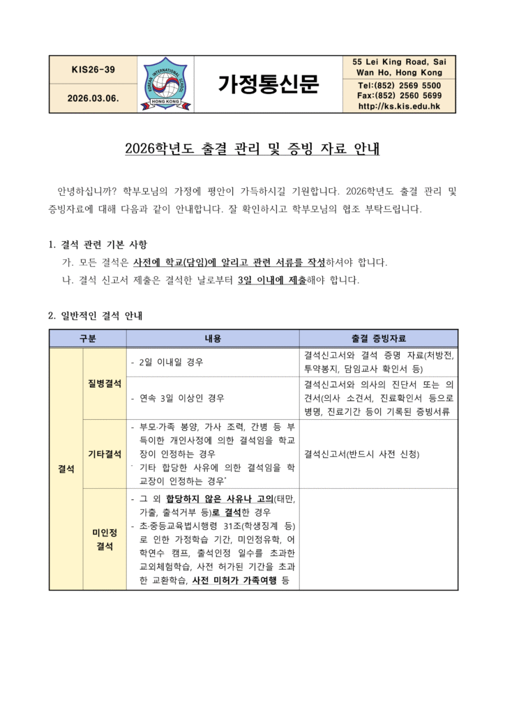 [가정통신문] 2026학년도 출결 관리 및 증빙 자료 안내