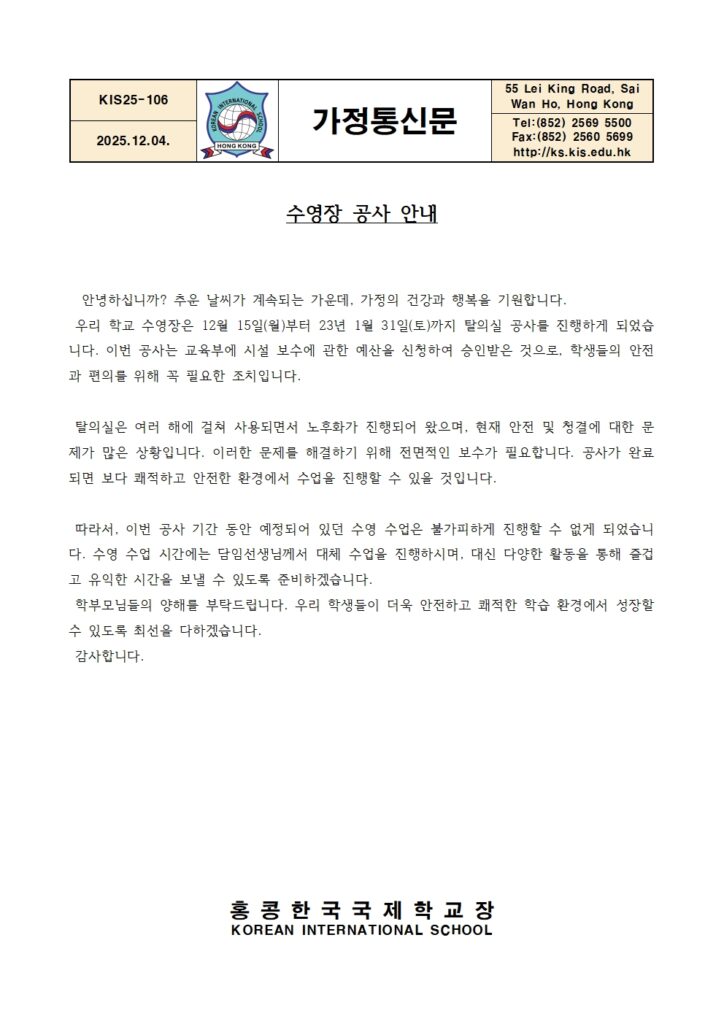 [가정통신문] 수영장 공사 안내