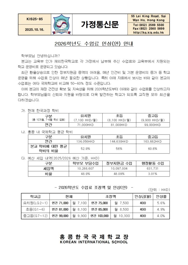 [가정통신문] 2026학년도 수업료 인상 안내