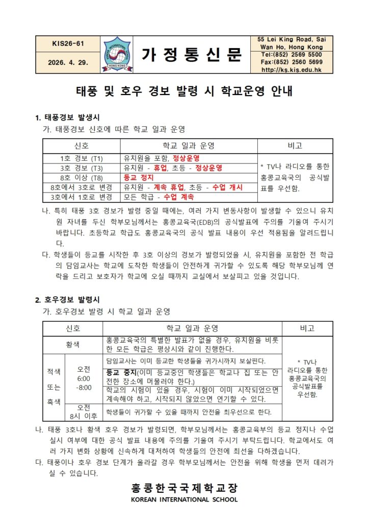 [가정통신문] 태풍 및 호우 경보 발령시 학교 운영 안내